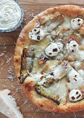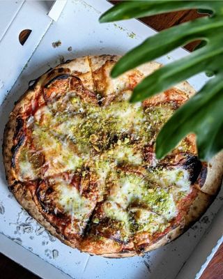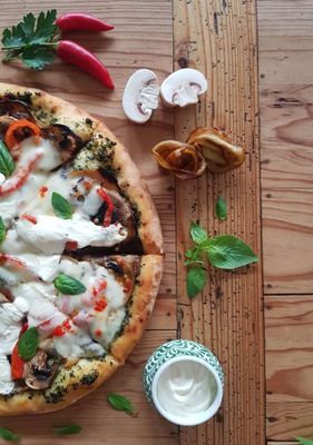 Fior di latte, ricotta, fried eggplant, mushroom, roasted capsicum, parsley, garlic, chilli