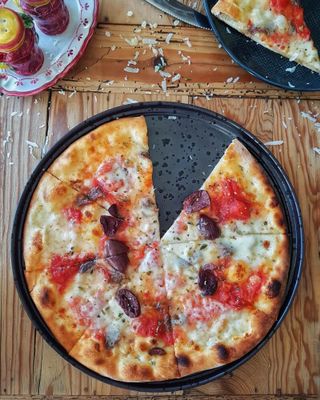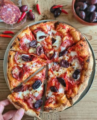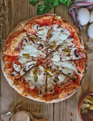 Fior di latte, smoked ham, mushroom, sicilian olives