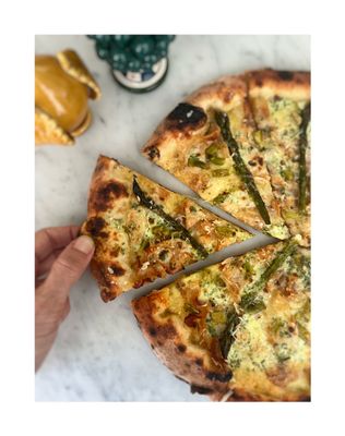 Porchetta, fior di latte, asparagus, ricotta with lemon & chives on an olive oil base