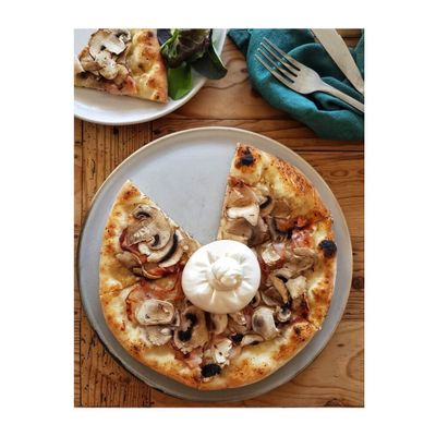 Burrata, spicy pancetta, mushroom, garlic, cracked black pepper