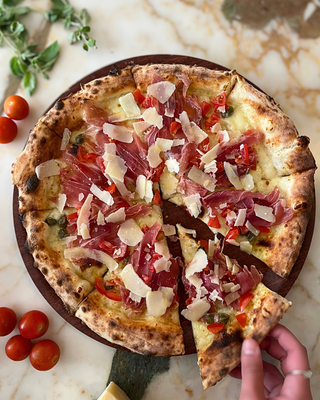 Olive oil base, fior di latte, fresh tomatoes, capers, prosciutto, oregano, shaved parmigiano